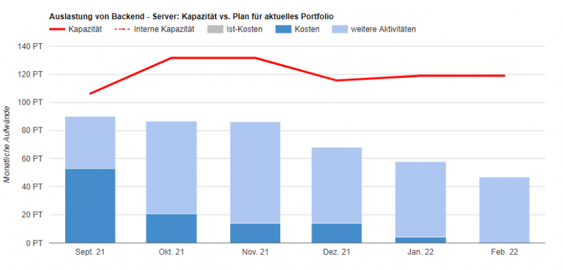 Ein interner oder externer Mitarbeiter kann mehrere Skills haben. Das wird in der Berechnung der Auslastung einer Skill berücksichtigt: bei der Berechnung des Auslastungs-Charts werden nicht nur die aus den Projekten des Portfolios kommenden Anforderungen an die Skill Backend Server berücksichtigt, sondern auch alle anderen Anforderungen an die Mitarbeiter, die die Skill Backend Server haben.