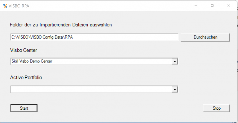 Beim Programmstart muss sich der Benutzer auf der Visbo-Plattform anmelden. Wenn der Nutzer Zugriff auf mehrere VISBO Center hat, so muss er das VISBO Center auswählen, in das die Informationen hochgeladen werden sollen. Wenn mehrere Portfolios vorhanden sind, wählen Sie bitte dasjenige, das alle aktiven Projekte enthält. Danach bitte das Fenster minimieren, nicht mit "x" beenden. Das Programm wartet bis Dateien gespeichert werden in der RPA Ordner und arbeitet sie ab.