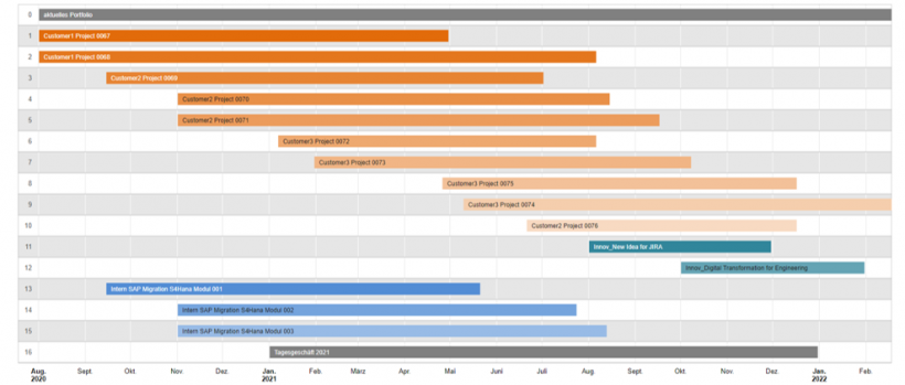 - Visuelle Projekt-Tafeln: Darstellung von Projekten eines Portfolios auf der Zeitachse mit farblicher Unterscheidung bzgl. Business Units