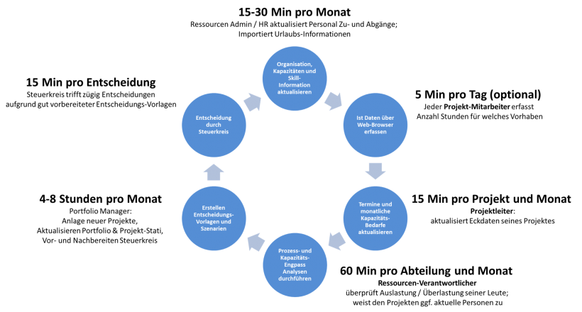 Wichtige Anmerkung: Die zeitlichen Angaben sind ein sicher ambitioniertes, aber machbares Ziel, das zu Beginn sicher noch nicht erreicht werden kann. Das Erreichen des Zieles erfoldert eine klare Prozess-Definition und das konsequente Anwenden und Einüben der erforderlichen Prozess-Schritte durch alle Beteiligten. Sehr wichtig für die Akzeptanz all der erfoderlichen Prozess-Schritte ist auch das Stattfinden eines regelmäßigen Steuerkreises, wo die aktuellen Ergebnisse besprochen werden und das Feedback an die Projektleiter und andere Beteiligten auch zurückfliesst.