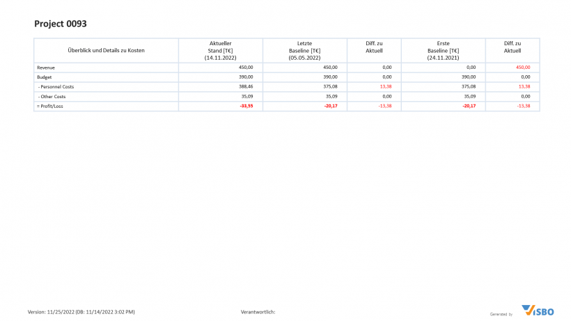 - Controlling Tabelle mit Soll-Ist Vergleich aktueller Planungs-Stand versus letzte Baseline versus erste Baseline