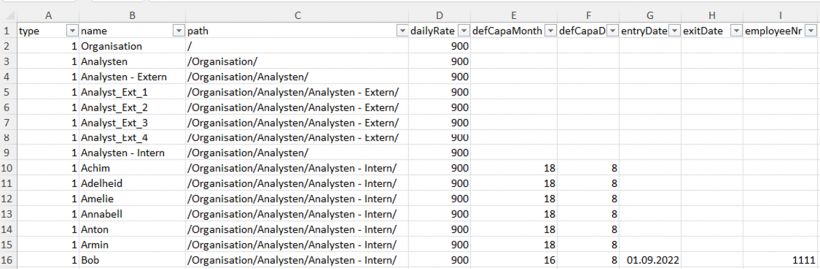 Fügen Sie eine neue Zeile in der Organisations-Datei ein mit folgenden Werten. (Type=1, name=Bob, path= /Organisation/Analysten/Analysten - Intern/, dailyRate 900, defCapaMonth 16, defCapaDay 8, entryDate 1.9.2022 und employeeNr=1111)