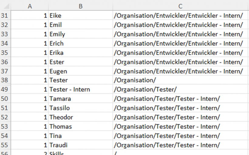 Erika wechselt von Entwickler-Intern zur Tester-Intern. Editieren sie die Organisations-Zeile für Erika und ändern das Feld Path auf „/Organisation/Tester/Tester - Intern/“
