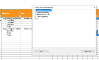 Mit der rechten Maustaste in Spalten-Header „Ressourcen“ kann eine Organisations-Einheit ausgewählt werden. Es werden die Einträge gefiltert, die gleich oder unterhalb der Hierarchie der ausgewählten Organisations-Einheit liegen. So kann z.B. auf alle Entwickler gefiltert werden.