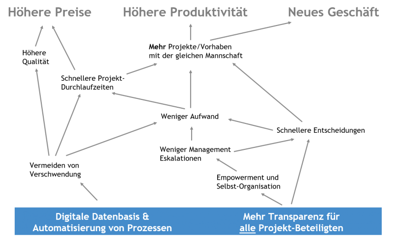 Diese drei Fundamente werden sich - wie im Wirk-Ketten Diagramm dargestellt – messbar positiv auf die Wertetreiber „Höhere Preise“, „Höhere Produktivität“ und „Neues Geschäft“ eines Unternehmens auswirken